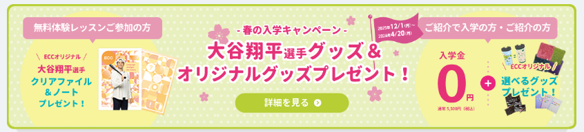 | 料金(月謝) | 4,400円~ (英語・英会話コースは6,600円~) 別途、教材費とECC全国児童・中学生英語検定試験受験料(2・3歳児を除く英語・英会話コース)が必要です。詳細はこちら。 |